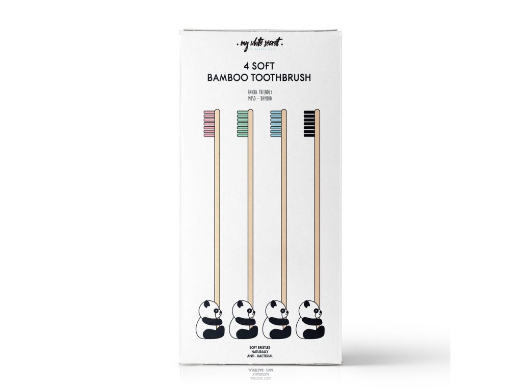 Rodinné balení obsahuje 4 bambusové kartáčky (růžový, modrý, zelený a černý).